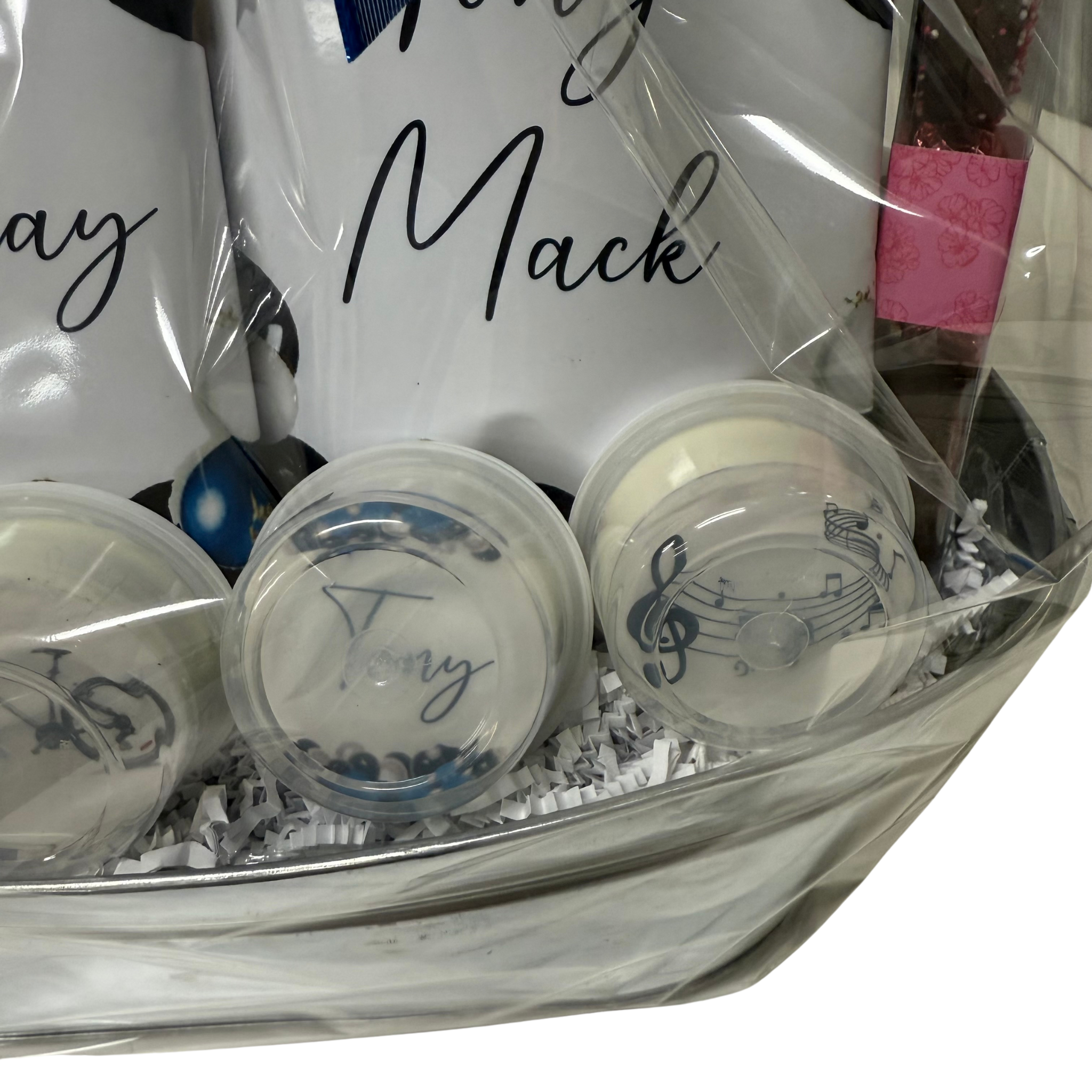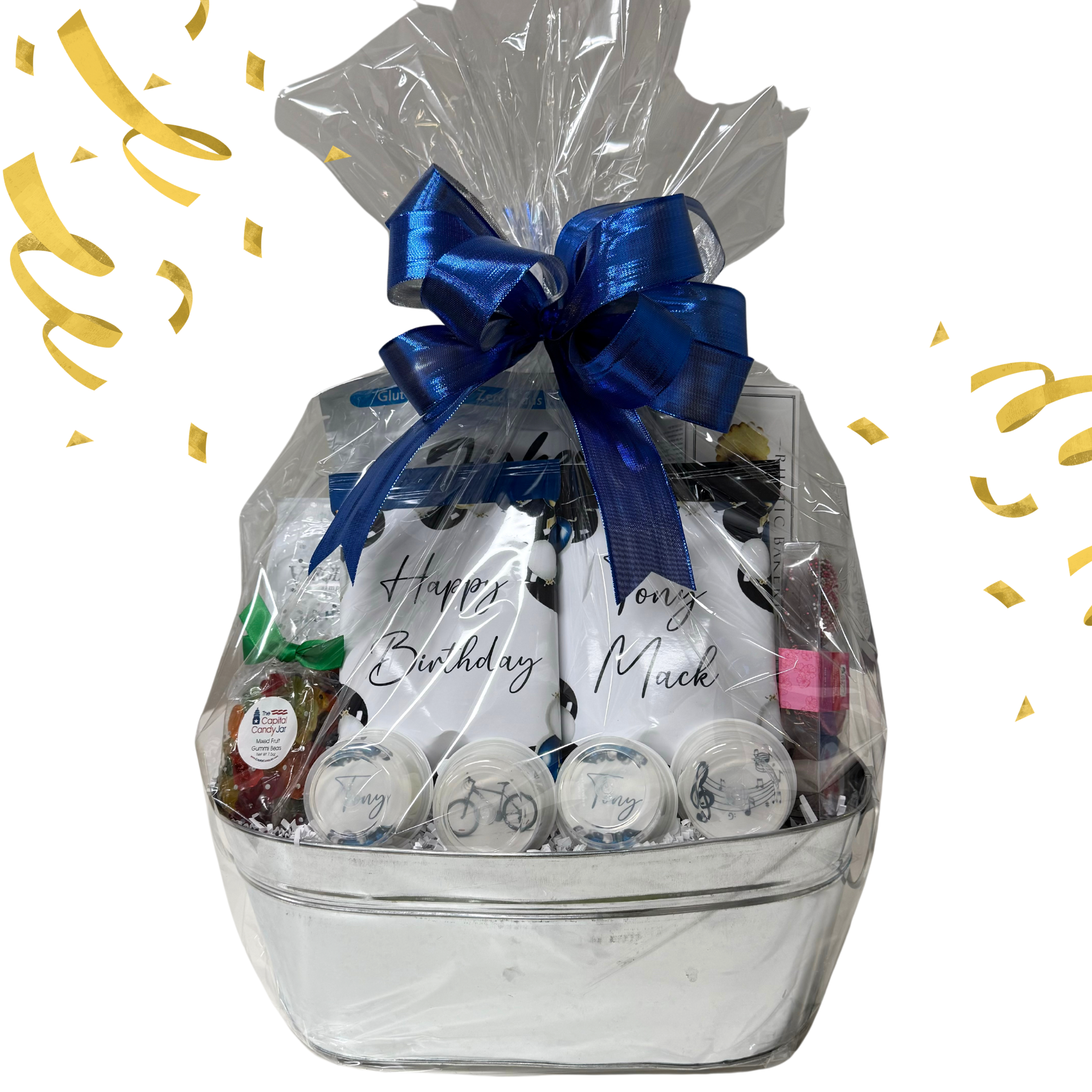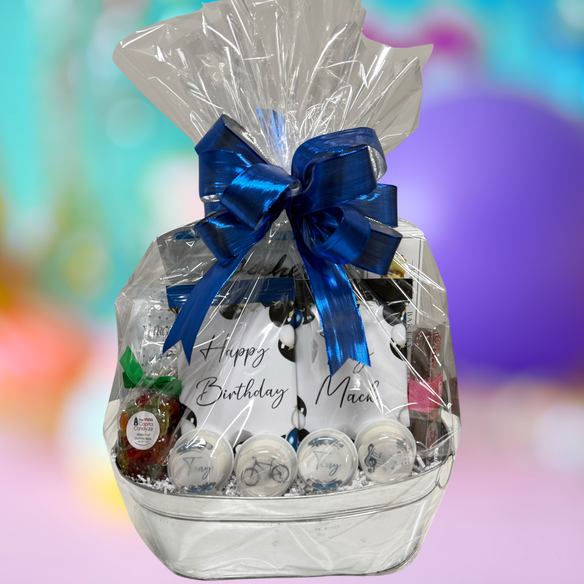 Make their birthday extra special! This customizable gift includes 4 white chocolate-covered Oreos with your choice of images or text, 2 chip bags with personal messages, and treats like gourmet popcorn, handcrafted chocolates, cheese spread with crackers and a small bottle of sparkling cider. We’ll coordinate the design and colors to create a truly unique gift. All packaged in a reusable silver bucket. Finished gift is approx. 18" tall, 16" wide - it’s the ultimate birthday surprise!