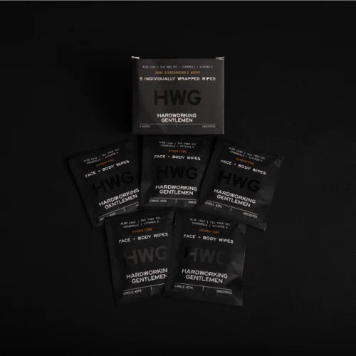 Five individually wrapped, unscented bamboo body and facial wipes add a practical touch, perfect for travel, workouts, or a mid-day refresh.