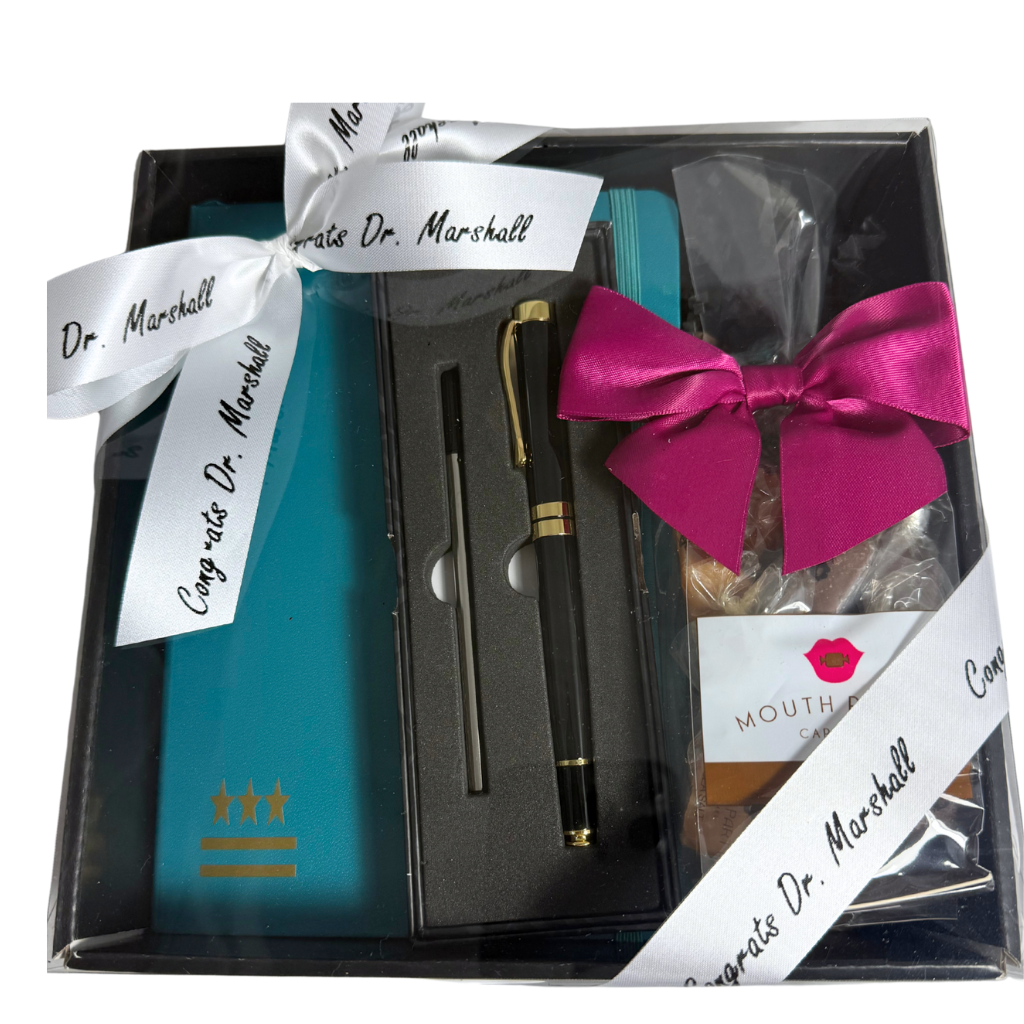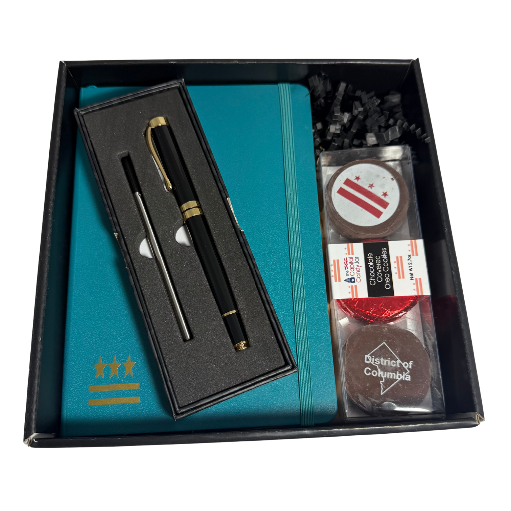 Inside, recipients will find a beautifully crafted 6x8 journal in black or teal, featuring a subtle DC flag design and 160 pages of high-quality, acid-free paper. With a lay-flat design, inner pocket, elastic enclosure, and ribbon bookmark, it's ready for notes, sketches, or reflections.