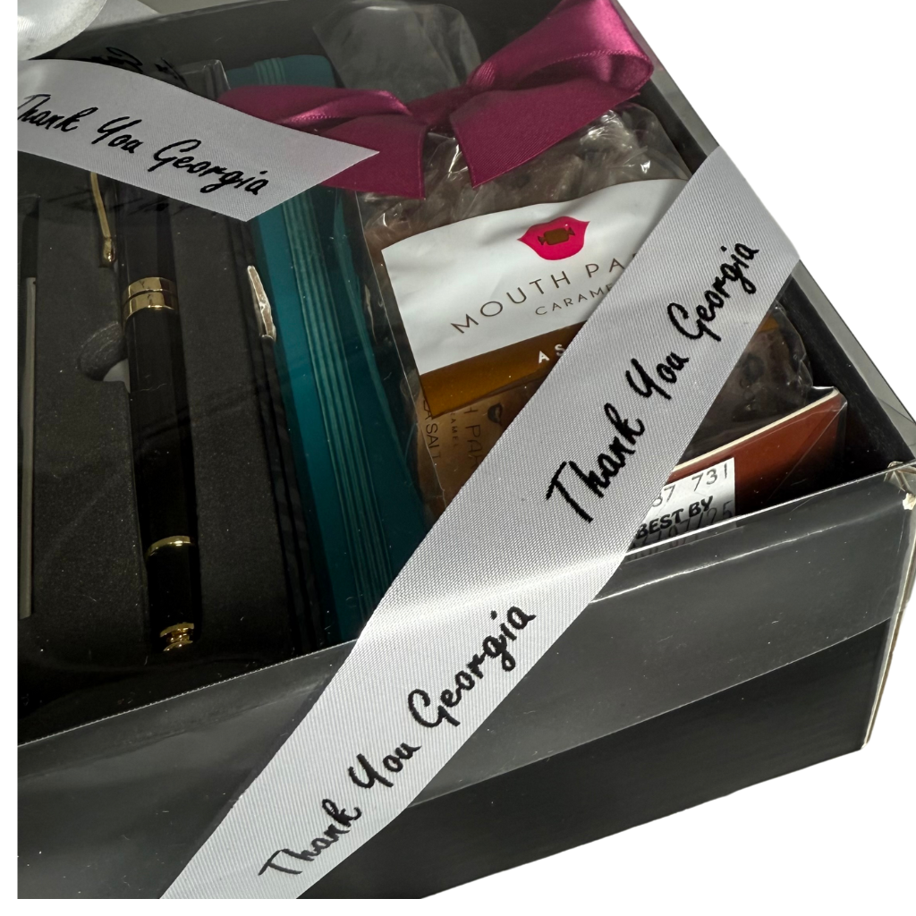 A gift that speaks volumes—before it’s even opened. The Signature Set is a sleek, modern gift box with a black base and clear lid that reveals the thoughtfully arranged treasures inside. Whether you're celebrating a milestone, welcoming someone back, or simply sharing inspiration, this set becomes uniquely personal with a custom-printed ribbon (up to 25 characters repeated) that wraps your message around the outside.